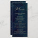 A winter wedding menu, inspired by a snowy night, features a dark blue watercolor background with the wording in gold.