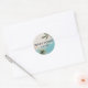 The Blue Watercolor Tropical Beach Gold Wedding Classic Round Sticker features a stunning design with blue watercolor waves, tropical accents, and elegant gold details, perfect for adding a touch of coastal sophistication to wedding invitations, favours, and decor.