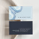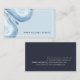 Elegant watercolor business cards feature geode or agate slice illustrations in pale blue ocean wave shades on a white background. Cards reverse to solid dark navy blue with white lettering, with fields for your full contact information.