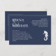 The pieces of this elegant wedding suite feature classic nautical styling with a clean, minimalist look. Stylistic waves in shades from aqua to navy blue and a seahorse illustration provide unique accents. This wedding details card shown here in white on navy blue, features plenty of room to add pertinent wedding information for your guests on both front and back. View the collection link on this page to see all of the matching items in this beautiful design or search ID836.