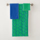 This towel set has a green washcloth, a blue hand towel, and a bath towel with an art deco design of blue curved lines in a triangle shape on a field of green repeated across the design. Want a different colour? Message me.