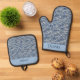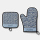 Abstract waves in shades of blue and white cover the front and back of this beautiful oven mitt and potholder set. Perfect for anyone who loves the ocean.