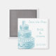 Save the Date magnets with a blue wedding cake.  Customise with your own info in the space provided.  Design also available on postcards & stamps.