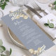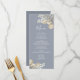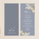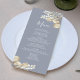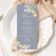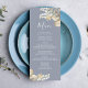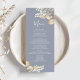 Enhance your formal dinner party with our blue wedding menu, a perfect blend of elegant reception decor and minimal elegance. Featuring simple floral greenery paired with classy gold foliage, this menu exudes timeless sophistication. The stylish calligraphy script and minimalist typography complement the classic traditional style, while the thoughtfully designed three-course meal layout ensures both beauty and practicality. Ideal for a formal dinner party, it adds a refined touch to your wedding decor.