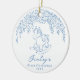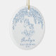 Personalized baby's first Christmas ornaments feature whimsical hand drawn doodle floral and rocking horse in dusty blue and white, cute and modern.