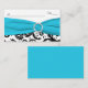 This black and white damask Place Card has an aqua blue PRINTED ribbon and PRINTED diamond jewel brooch that would be perfect for an aqua and black themed wedding.**NOTE, if you change the size of the card, or if you change the fonts, or the size of the font, some of the design and/or text may get cut-off. Everything will print as you see it on your monitor. I will not see changes you make, and Zazzle will NOT correct anything (typos, mis-alignment etc.). The text is all customisable. If you need help with this product, please email me BEFORE you place your order. If you require any other matching items, please email your request to niteowlstudio@gmail.com