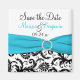 This black and white damask Save the Date magnet has an aqua blue PRINTED ribbon and PRINTED diamond jewel brooch that would be perfect for an aqua and black themed wedding.****If you change the shape and/or size of the magnet, or if you change the fonts, or the size of the font, some of the design and/or text may get cut-off. Everything will print as you see it on your monitor. I will not see changes you make, and Zazzle will NOT correct anything (typos, mis-alignment etc.). The text is all customisable. If you need help with this product, please email me BEFORE you place your order. If you require any other matching items, please email your request to niteowlstudio@gmail.com