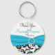 This black and white damask Thank You keychain has an aqua blue PRINTED ribbon and PRINTED diamond jewel brooch that would be perfect for an aqua and black themed wedding. Everything will print as you see it on your monitor. I will not see changes you make, and Zazzle will NOT correct anything (typos, mis-alignment etc.). The text is all customizable. If you need help with this product, please email me BEFORE you place your order. If you require any other matching items, please email your request to niteowlstudio@gmail.com
