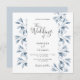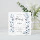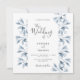 A trendy wedding invitation in white and dusty blue. A chic white backgound on the front. Decorated with botanical blue coloured sprigs and foliage. Modern large handlettered script, typography with the text: The wedding of. Templates for first names and wedding details. Dark grey text.