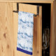 A kitchen towel with vintage blue and white Delft art of a sailboat sailing on the water in the harbour, surrounded by floral elements, reproduced from an antique tile, with blue borders.