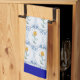A kitchen towel with a unique design of a vintage Delft tile pattern of a yellow tulip surrounded by floral elements in blue on white, from an antique tile with blue borders