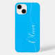 Blue White Elegant Calligraphy Script Custom Personalised Name iPhone 14 Smart Phone Cases features a modern and trendy simple and stylish design with your personalised name in elegant hand written calligraphy script typography on a blue background. Designed by ©Evco Studio www.zazzle.com/store/evcostudio