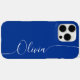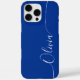 Blue White Elegant Calligraphy Script Custom Personalised Name iPhone 16 Pro Max Smart Phone Cases features a modern and trendy simple and stylish design with your personalised name in elegant hand written calligraphy script typography on a blue background. Designed by ©Evco Studio www.zazzle.com/store/evcostudio