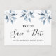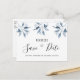 An elegant and trendy wedding Save the Date card. White background and black text on front. Decorated with bue coloured botanical florals and foliage. Save the Date is written with a black modern hand lettered style script. Templates for the wedding date and your text.