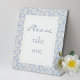 'Please take one'. Chic & fresh with youthful charm. This wedding pedestal favour sign delights with a set of trendy and modern fonts set in an crisp white rectangle and framed with a blue & white floral border.