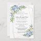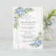 Airy and modern blue and white floral floral design. A thin gold geometric frame gives this wedding invitation its structure. Two blue hydrangea and ivory peony arrangements are placed on two of the corners. Lots of greenery, leaves and dangling vines give it a modern Boho vibe.