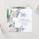 Honour a special woman with this elegant and feminine 90th Birthday party invitation. 90th is written in large blue text. Birthday celebration follows. The honoured guest's name is written in a modern script font. The birthday celebration details are surrounded by a chic open wreath that is decorated with white roses and blue flowers. The floral elements are nestled in green leaves. While it is a traditional design, the open and airy botanical foliage and text give it a contemporary vibe.
