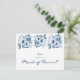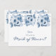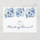 On front: A classic chic white background. Decorated with watercolored flowers, florals in shades of blue. Template for the maid of honour's name. Text: Will you be my Maid of Honour? The text: Maid of Honour is written with large modern hand lettered style script, blue coloured letters.