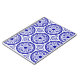 An original delft-inspired faux tile pattern in blue and white with ornate scrolls.on the edges and a centre with a gothic pattern of crosses and leaves.