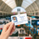 Employee ID badge with a clean minimalist design in blue, black, and white where a geometric frame in sky blue and deep blue surrounds the photo of your employee. Add your logo next to the name of the work place and the name of the department in which the employee works.