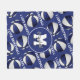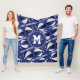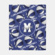 This team colours fleece blanket features stylised basketballs that have alternating blue and white recolored panels - athlete name and monogram can be personalised on the large circle pendant that overlies a mirrored pattern of small basketballs and the sporty font text "I love basketball" in white stretching between the angled rows of basketballs - background is customisable blue - easily delete the "I love basketball" text lines, if desired, or replace the monogram with the player's varsity letter or jersey number - by katz_d_zynes