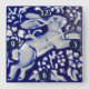 My original, copyrighted leaping hare tile in rich blue and white. The original piece's glossy glaze reflected the light, hence the highlights on this piece.