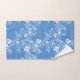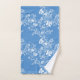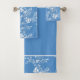 This attractive bathroom towel set features a pretty white ocean themed design on a medium blue background. The hand towel and wash cloth have the pattern repeated across the entire surface; the large bath towel has the pattern as a bottom border, with a matching solid blue interior. Be sure to see the matching products, including shower curtains, in our store.