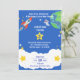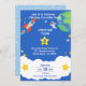 Outer space Birthday Party Invitation with a blue and white background, yellow stars, a planet, a spaceship, and an astronaut. Add your party details to our easy to use template. You can see what your invitation will look like before purchasing.