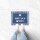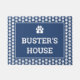 Blue and white dog house door mat with a paw print monogram, a paw print pattern, and your dog's name in big white letters.