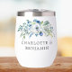 Cheerful white peony flowers and green watercolor leaves form a beautiful border on a pretty personalised blue floral spring wedding wine tumbler for your chic garden reception. Customise with your names under the beautiful bouquet for a sweet keepsake.