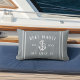 Add a cool custom touch to your fishing boat, sailboat, yacht, or houseboat with this personalised pillow. Rustic nautical design features your boat name, ship's registry, and year established in white lettering, with an anchor illustration and rope stripe detailing on a soft slate blue background.