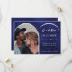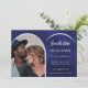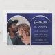 On front: Add your own vertical size photo. Faux gold photo arch frame. A navy blue background, white text. The blue colour is uneven. Personalise and add your names and the date.