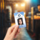 Professional photo ID badge featuring your custom photo and logo on an elegant blue white design with some fluffy clouds. On the back you can add a custom bar code or QR code and additional texts (or delete the templates).