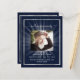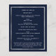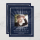 An elegant 2-page program. A dark blue background, a faux silver looking frame, and space for a photo. Light beams behind the photo. Personalise and add name, dates and your text.