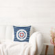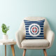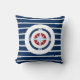 Elegant and trendy navy blue and white nautical, beach or coastal decor throw pillow with navy blue and white stripes and compass rose on one side with a red accent and a navy blue and white stripes pattern background on the other side. These fresh clean comtemporary colours and design will enhance any home, beach house, lounge, sofa, bedroom, office or boat.