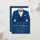This classy men's birthday party invitation features an image of a blue tuxedo with white shirt and black bow tie. The invitation and details appear in white sans serif type, with the guest of honour's name in an art deco-inspired font. The back is solid blue.