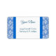 Editable address labels with an elegant vintage damask pattern in white on cornflower blue with script and block letters in deep blue, on a white ribbon.