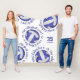 This cute volleyball themed fleece blanket features 5 randomly arranged blue and white volleyballs with the text, "The volleyball court is my happy place" in blue encircling each volleyball in a fun handwritten style typographic font, all on a white background - the volleyballs' blue panels are blended with an artsy, girly floral pattern - her name and jersey number are customisable - by katz_d_zynes