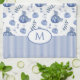 Pretty blue and white pumpkin, berries and assorted greenery (in blue) pattern on top with a blue and white vertically-striped pattern on bottom.  Simply add your initial to the oval shaped emblem.