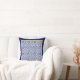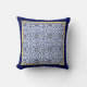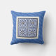 Blue white yellow pattern Mediterranean style, double-sided, artsy indoor or outdoor Throw Pillow, designed by PiccoGrande, featuring Blue white yellow pattern Mediterranean style blue-white frame at the front, and same tile pattern over lighter blue background, and custom name at the back.