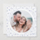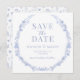 Chic and sophisticated, this Save the Date photo invitation for a boho wedding showcases an elegant rustic botanical theme with light blue flower blooms.