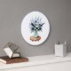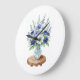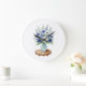 Blue and white wildflowers in a blue and white vase sitting on a stool wall clock.