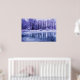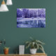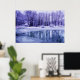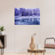 This fine art poster presents a seasonal winter landscape in shades of blue, violet, grey, white and purple. The trees are bare. Ice covers part of the water but lovely reflections of tree, clouds and sky shine through. Snow surrounds the pond.