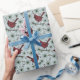 This elegant winter wrapping paper features a pattern of hand-drawn red cardinal birds perched on a pine branches against a soft blue background.