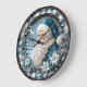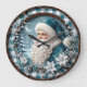 This festive, cool-toned round clock features a jovial Santa Claus with a long, sculpted white beard, dressed in a blue coat and hat against a snowy night sky. He is surrounded by a wreath of white poinsettia flowers, silver berries, and snow-dusted pine branches, all framed by a woven wooden ring and an inner blue plaid border. The design may look real due to the high detail and three-dimensional texture in the artwork.