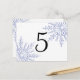 Customise these festive Blue Winter Snowflakes on White Table Numbers and create a different card for each table at your December, January or February marriage reception, bridal shower or engagement party. This elegant custom wintery table number cards feature intricate blue snowflakes adorning the corners with a white background.