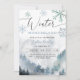 Modern boy's birthday party invitation card featuring watercolor art of the winter mountain with pine trees with blue snowflakes. The text says "Winter Wonderland."