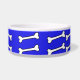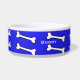 White ceramic dog food / water bowl, with blue, around the outside. Graphics of cartoon bones, run around the outside of the bowl. White custom text, on the front, is ready to personalise, for your pet or as a great gift idea for any pet owner. Matching pet products are available.