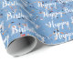 Wrapping paper with a blue background and sprinkled with multi coloured confetti. Happy Birthday is written all over in white type.