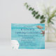 Beach party wood look invitation postcard for any occasion. This card sample wording is for a birthday party, but the three template text areas work for other celebrations as well. Blue wood background with sand dollar, starfish and spotted junonia shell design and printed black text. The line with party type / name is in larger lettering. Use the text template on reverse to add each mailing address, or that text can be deleted to order postcards blank and hand-write addresses.